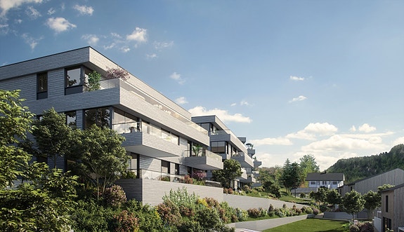 Høyt og fritt beliggende i 3 mindre bygg med 3, 4 og 5 etasjer. Nye 2, 3 og 4 roms selveierleiligheter med flotte, solrike balkonger med fin utsikt mot vest.