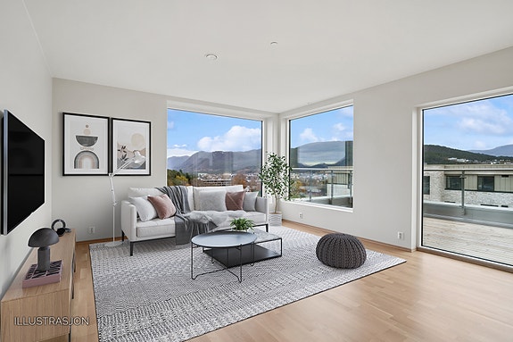 Leiligheten A5-1 er ferdigstilt og klar til innflytting. Her får du en lys og romslig bolig med gjennomtenkte løsninger og en fantastisk terrasse på hele 30 kvm med flott utsikt.