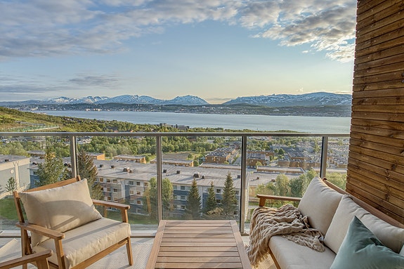 Den vestvendte, innglassede balkongen på ca. 17 kvm fungerer som en forlengelse av stuen og gir deg mulighet til å nyte utsikten og kveldssolen hele året.