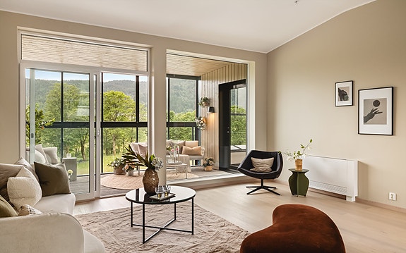 Leiligheten har også en takterrasse på 36 kvadratmeter som omgir leiligheten, 11 kvadratmeter er innglasset hvor man kan åpne opp om ønskelig og nyte kveldssolen til langt på kveld. Den romslige stuen har plass til flere sosiale soner, har mye luft under taket og vakker og grønn utsikt. Toppleiligheten blir levert med kjøkkenmodell Sigdal Amfi Eik med håndtak festet på bakside dør, demping på dører og skuffer, bestikkinnlegg og avfallsløsning med lokk, laminat benkeplate med underlimt vask.