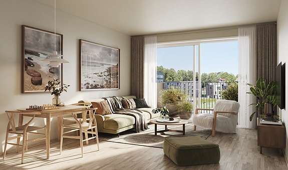 3D-illustrasjon fra en 66 kvm. i Rådhusmarka Pluss. Utsikt fra denne leiligheten er ikke lik.