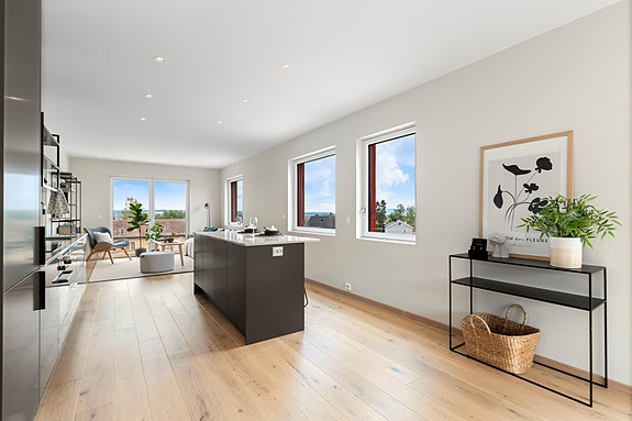 Her har vi gleden av å presentere leilighet B303 i Ankerhagen. Leiligheten ligger i bygg B, 3. etasje, og den har god internbeliggenhet på enden av bygget. Her får du vinduer på tre sider som gir godt med lysinnfall i leiligheten, samtidig som du kan nyte fin utsikt mot Hamar by og Mjøsa. Interiørarkitekten har valgt ut nøye, samstemte farger og materialer til denne leiligheten. Noe som gir en gjennomgående lekker og moderne standard.