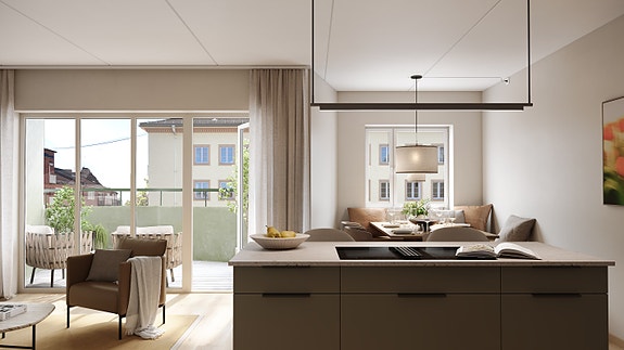 Det leveres kjøkken fra HTH i typen Focus, farge Leire, med integrerte hvitevarer fra Miele. Leiligheter med platetopp i kjøkkenøy leveres med benkeventilator med kullfilter fra Miele.