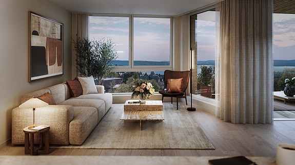 I samarbeid med arkitekt og interiørarkitekt har vi valgt gode, anerkjente leverandører. Kjøkkenet er fra HTH, modellen Nordic Atmosphere, et elegant kjøkken i røkt, brun eikefinér med benkeplate i kompositt og hvitevarer fra Miele. På gulvet legges eikeparkett og delikate fliser i entré og bad, oppvarmet med vannbåren gulvvarme. For å skape et lunt og harmonisk interiør vil innredningen på baderomsmøblene ta opp kjøkkenfargen, og både bad og kjøkken får blandebatterier i bronse fra Tapwell. Veggene males i lyse, varme toner som står fint til treverket på gulv og innredning. Dette skaper den koselige atmosfæren vi ønsker oss og gir mulighet til å skape en personlig stil uansett om man foretrekker fargerik kunst som skal fremheves eller lyse ton i ton-møbler. Utsikten vil bli 19 vakre leiligheter man kan bo i for alltid.