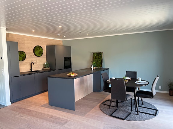 Schmidt kjøkken. Varme i alle gulv. Ved fyring. Parkett. Fliser i gang. Stor bod. Stort opparbeidet uteområde. Stor mark terrasse. Robot gress klipper.