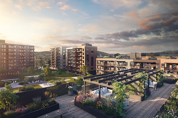 Til glede for alle beboere planlegger vi en innbydende, todelt takterrasse. I den ene delen legger vi til rette for sosialt samvær og godt naboskap, mens den andre delen gir mulighet for å kjøpe en privat takterrasse – perfekt for deg som ønsker mer plass og privatliv.