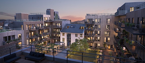 Mellom byggene vil den grønne hagen være en skjermet oase med blant annet lekeplass, pergola og drivhus. I tillegg til private uteplasser tilbyr Farveriet romslige takhager som vil bli herlige sosiale soner midt i det urbane bybildet. Et perfekt sted å nyte morgenkaffen mens sola står opp, eller samle naboer til lystig lag på varme sommerkvelder.
