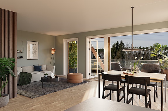 Her skapes det et godt bomiljø med energieffektive løsninger, særegen arkitektur og lekre materialvalg. De store, fine fellesområdene, med både sittebenker og egen bocciabane, oppmuntrer til fellesskap og aktiviteter; og skaper et sosialt og engasjerende nabolag. Vil du trekke deg tilbake, kan du sette deg på din egen balkong, som er både skjermet og romslig, med flott utsikt til de vakre naturomgivelsene.