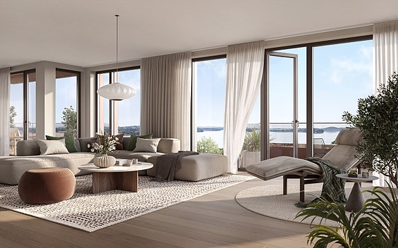 Herlig stue med mye lys og panoramautsikt. Illustrasjonen er av en tilsvarende leilighet i Staudelia 111. Avvik i standard og utsiktsforhold må påregnes.