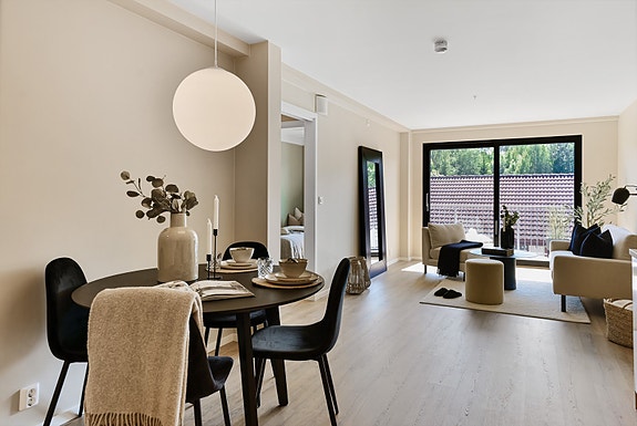 I denne leiligheten er det kjøkken og stue i åpen løsning med god plass til spise- og sofagruppe. Foto: Jenserud Foto (Kjell Vidar Martinsen)