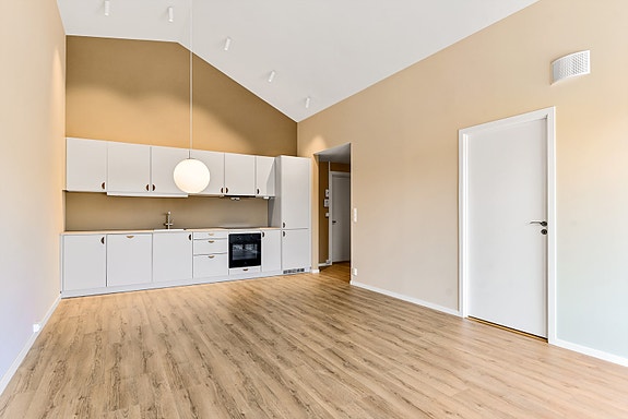 Leiligheten har røstet himling med flott takhøyde, noe som gjør at leiligheten virker større, mer luftig og får et særegent preg utenom det vanlige. Spotter i tak over kjøkken. Foto: Jenserud Foto (Kjell Vidar Martinsen)
