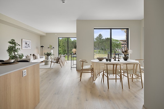 Leilighet B2-403 er en elegant leilighet med gjennomtenkt planløsning og kvaliteter. Den åpne løsningen mellom kjøkken og stue, kombinert med store vindusflater, gir en luftig romfølelse, og slipper inn rikelig med naturlig dagslys gjennom hele dagen. Den innglassede balkongen på 12 kvm fungerer som en forlengelse av oppholdsrommet perfekt for rolige morgener eller sosiale kvelder.