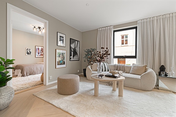 Denne hjørneleiligheten byr på et varmt og tidløst interiør med lune fargetoner og klassiske materialvalg som skaper en balansert og innbydende atmosfære. Boligen har gjennomtenkte løsninger som gir god romfølelse, samtidig som hvert område er funksjonelt og komfortabelt.