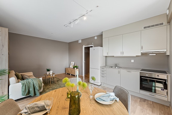 Leiligheten har god planløsning med gang, bod, stort flislagt bad, og romslig stue med åpen løsning til kjøkkenet. God takhøyde gir stue og kjøkken ekstra romfølelse!