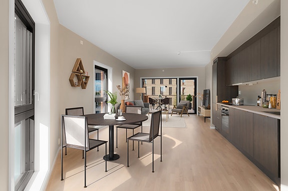 Åpen og innbydende 3-roms selveier leilighet med god internbeliggenhet i byggets 2. etasje. Takhøyde på 2,5 meter, med store vinduer som slipper lyset inn. Pen og tidsriktig lys hvitpigmentert 3-stavs eikeparkett. Balansert ventilasjon sørger for godt inneklima. Vannbåren varme via gulvvarme sørger for en stabil og behagelig innetemperatur, samt lave kostnader for oppvarming. Åpen stue/kjøkken løsning med utgang til flott balkong, samt to bad. To romslige soverom.