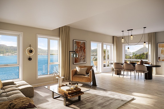 Her er det plass til både hverdagsliv og gjester. De store vindusflatene gir gode lysforhold og bringer sjøen nærmest inn i leiligheten. De to balkongene er ideell for kaffe i morgensolen eller avslappende lesestunder med fjorden som bakteppe.