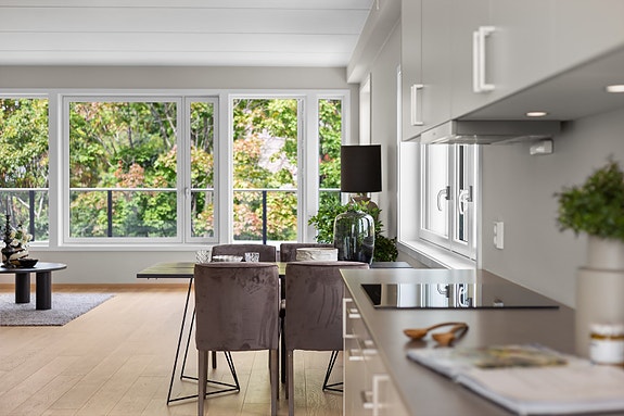 Store vindusflater på tre sider som gir en sjelden lys og romslig følelse. Planløsning med åpen stue- og kjøkkenløsning, to romslige soverom og to lekre bad.