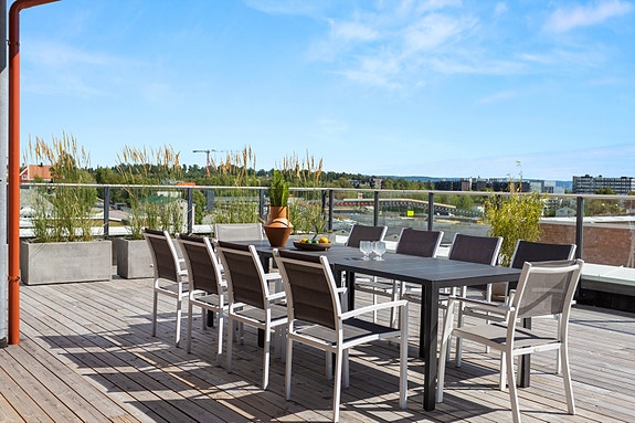 På toppen av Smedens Hage finner du G501 en sjelden 4-roms toppleilighet med hele 160 m² privat takterrasse. Her får du panoramautsikt, sol hele dagen og unike muligheter for både rolige stunder og store sammenkomster alt i en moderne leilighet med bla. tre soverom, to bad.