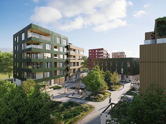 å skape boliger med variasjon. Variasjonen gir området et vennligere uttrykk og flere soltimer. Derfor finner du boliger i ulike størrelser og utforminger – både leiligheter og byhus.