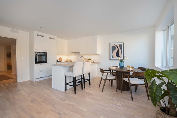 I den romslige entréen er det rikelig med plass til garderobe og oppbevaring. Videre finner du et lyst og luftig stue-/kjøkkenområde på hele 38,7 kvm, hvor de store vindusflatene gir en lys og luftig følelse. I dette rommet er det god plass til stuemøblement og spisebord. Kjøkkenet er i åpen løsning, men utformingen gjør at det også er avgrenset fra stuen.