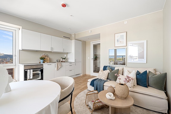 Pen og praktisk 2-roms med fantastisk beliggenhet i 8.etasje! Nyboligstandard. Balkong. Innflyttingsklar i november!