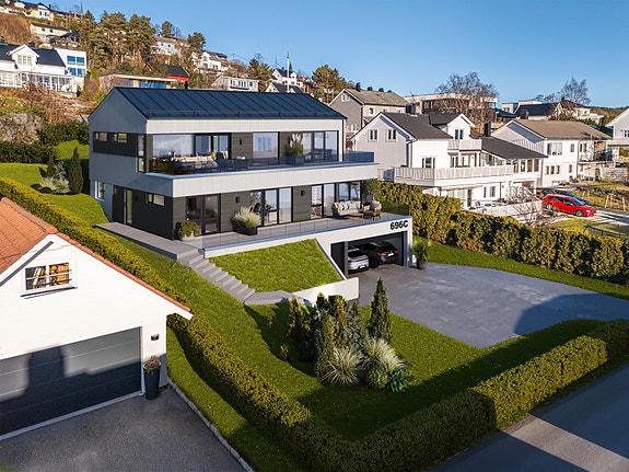 Stor, arkitekttegnet enebolig beliggende i Borgundvegen 696C, med ny innkjørsel fra Strandavegen. Denne moderne boligen, som erstatter en eldre bygning på eiendommen, er nøye utformet for å harmonisere med det eksisterende nabolaget. Med et bruksareal på ca. 250 kvm og et garasjeanlegg på ca. 50 kvm, tilbyr denne boligen både romslige og funksjonelle løsninger, samt fantastisk fjordutsikt.