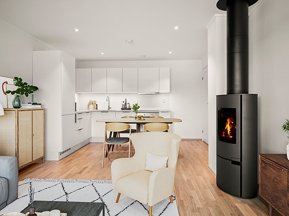 Ny innflyttingsklar leilighet med 2 soverom, peisovn, kjøkken fra HTH inkl hvitevarer, carportløsning med bod