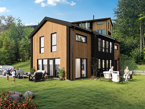 Perspektiver og 3D tegninger er kun av illustrativ karakter og definerer ikke det nøyaktige innhold eller omfanget av leveransen. Dvs. hekker, beplantning, plen, utvendig/innvendig møblering, gjerder mm. er ikke en del av leveransen. Den videre detaljprosjekteringen kan medføre endringer som er nødvendige eller hensiktsmessige.