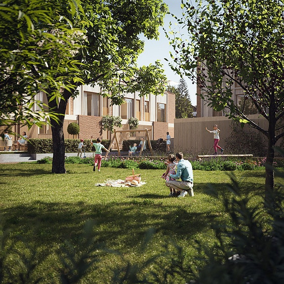 Velkommen til Frøy, et nytt prosjekt bestående av 30 townhouses på Bekkestua. I FRØY danner et klassisk bykvartal rundt en stor felles hage - til glede for store og små. Kun ment som illustrasjon.