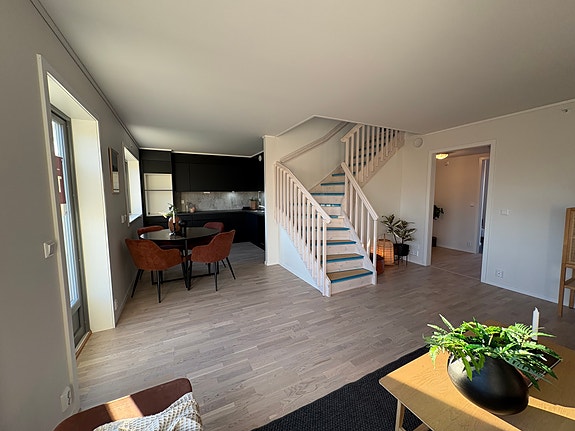 Lys og luftig stue med åpen kjøkkenløsning. Pent kjøkken med sorte fronter fra KEO. Utgang til solrik veranda.