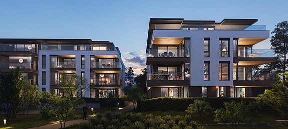 Fra den felles garasjekjelleren under hvert bygg går det heis opp til din etasje. Uteområdene blir nennsomt beplantet og diskré lyssatt, og en vakker hekk vil skjerme for innsyn til første etasje.