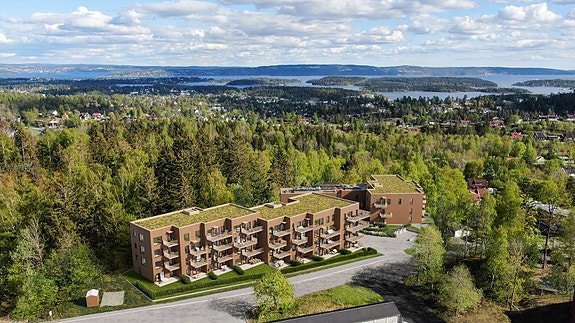 - Bygget i sør (B2) er lavere og tilpasser seg terrengets helning, noe som gir gode solforhold, trivelige felles uteområder og en flott utsikt fra takterrassen.
