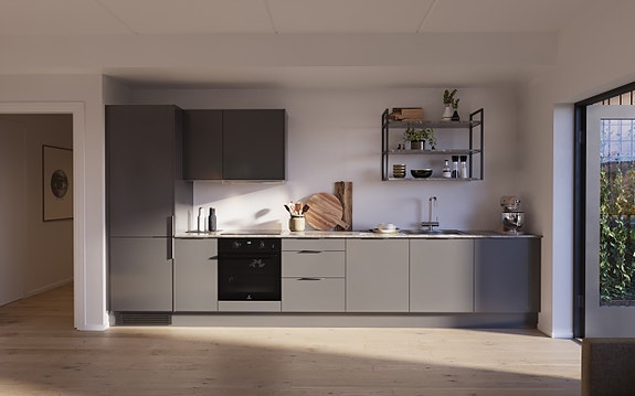 Slik får leiligheten et luftig preg. Kjøkkeninnredningen er fra Sigdal og heter Vidde. Frontene kommer i nyansen granitt. Frontene er 16 mm tykke og slette. Benkeplaten er i to centimeter tykt laminat i fargen grå marmor.