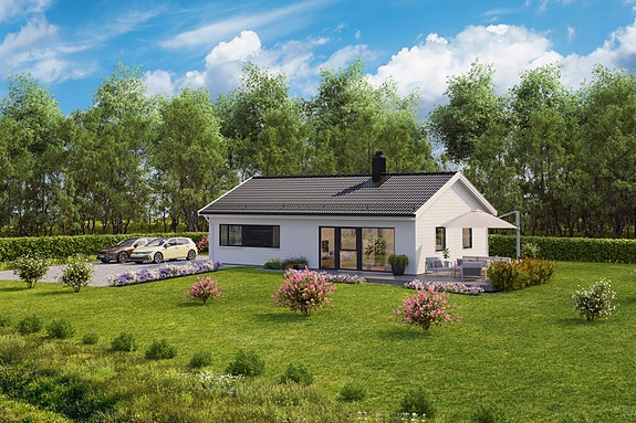 Utvendig leveres boligen med liggende, grunnet hvit kledning samt 3-lags vinduer.