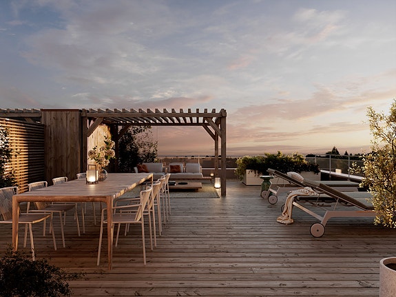 På takterrassen vil det leveres pergola og praktisk oppbevaringsbod.
