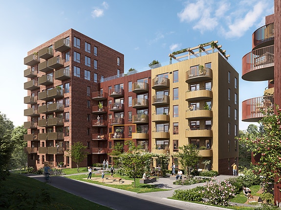 Leiligheten gir deg enkel tilgang til gode fellesarealer både ute og inne. I bakgården finner du grønne møteplasser med sittegrupper og grillmuligheter, mens store takterrasser med utsikt over Trondheim står klare når du vil trekke deg opp i høyden.