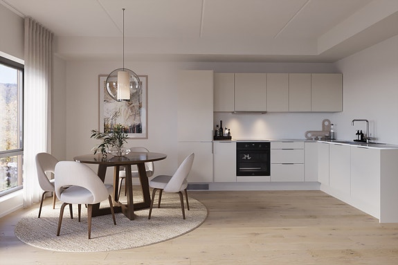 Den åpne og sosiale kjøkkenløsningen får moderne innredning fra Sigdal i type Vidde. Benkeplate i 20 mm laminat med nedfelt kum og blandebatteri fra Tapwell eller tilsvarende. Skuffer og skap med demping, ventilator fra Røros med lys, eller tilsvarende. Kjøkkenet leveres med integrerte hvitevarer ferdig montert: induksjon platetopp, stekeovn, oppvaskmaskin og kjøl/frys kombiskap som standard. Alle kjøkken leveres iht. kjøkkentegning fra leverandør.