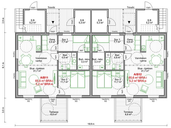 · Leilighetene i 2.etg blir utført med pipe og ovn for vedfyring. Balansert ventilasjon med varmegjenvinning inngår. Ellers blir alle rom unntatt bad/vaskerom samt bod utstyrt med elektriske panelovner. Bad/vaskerom får elektriske termostatstyrte varmekabler i gulv. Det blir etablert elektrisk koplingspunkt for varmegjenvinning i tilfelle boligkjøper ønsker å anskaffe dette i egen regi.