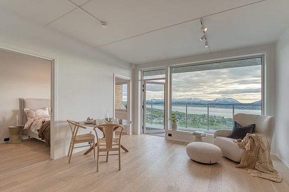 Lys og moderne stue med fantastisk utsikt over Tromsøysundet og fjella på Kvaløya. Utgang fra stue til innglasset balkong. Bilde tatt fra en annen leilighet