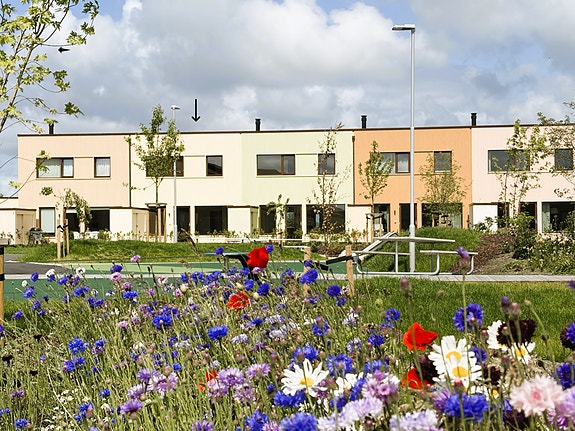 Nytt rekkehus med varme farger, frodig beplantning og et trivelig tunmiljø. Her bor du i et trygt, bilfritt og familievennlig nabolag omgitt av grøntområder og blomstrende omgivelser.