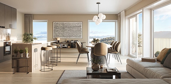Velkommen til Sjøhagen BBB4 - 301. En lekker gjennomgående endeleilighet med fantastiske solforhold og utsikt. 3D-tegningen viser stue og kjøkken og er fra leiligheten over.
