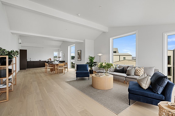 Leiligheten har en gjennomført og tiltalende utforming med materialer av høy kvalitet. Stue- og kjøkkenløsningen på hele 61,6 kvm gir god romfølelse, med store vindusflater som slipper inn mye lys og skaper en behagelig atmosfære. Kjøkkenet har heltre fronter i en varm nøttetone og benkeplate i kvartkompositt – en kombinasjon som gir et stilrent og solid uttrykk. Her er det god plass til både spiseplass og sofagruppe, og fra stuen er det utgang til en flott takterrasse på 27,1 kvm.
