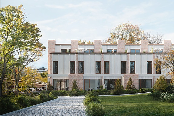 Frøy, et nytt prosjekt bestående av 30 townhouses på Bekkestua. Arkitekten R21 har latt seg inspirere av den sentrale beliggenheten og tatt med seg prinsipper fra kjente og historiske townhouseprosjekter i Danmark og England. Kun ment som illustrasjon.