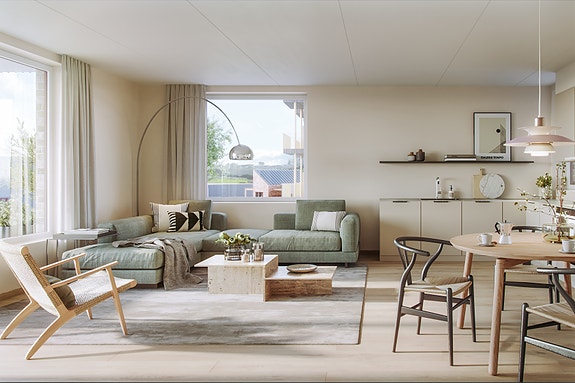 - Oppholdsrommet er lyst og romslig med store vindusflater, moderne 1-stavs parkett og vannbåren gulvvarme.