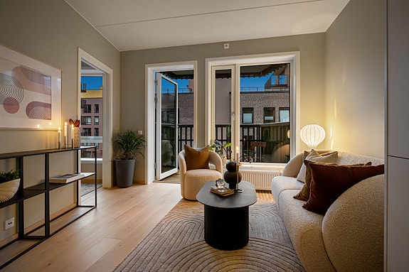 Entré med to-veis porttelefon og plass til garderobe for oppbevaring. Åpen stue/kjøkkenløsning med plass til spisebord og sofa. Lekker kjøkkeninnredning fra Sigdal. Det er utgang til balkong fra stuen. Store vindusflater gir godt med lysinnslipp. Soverom med mulighet for graderobeløsning. Moderne flislagt bad med bla. vannbåren varme i gulv, downlights i tak og opplegg for vaskesøyle.