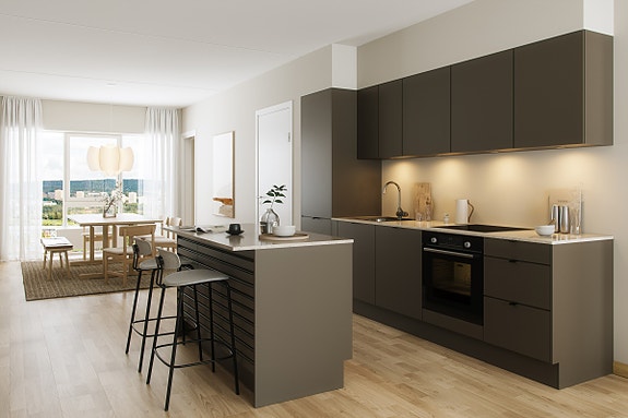 Det leveres moderne kjøkken fra Sigdal med kjøkkenøy og integrerte hvitevarer. Fargen på kjøkken avviker fra leveranse som er en lysere fargepalett. Dette er en illustrasjon, og avvik kan forekomme