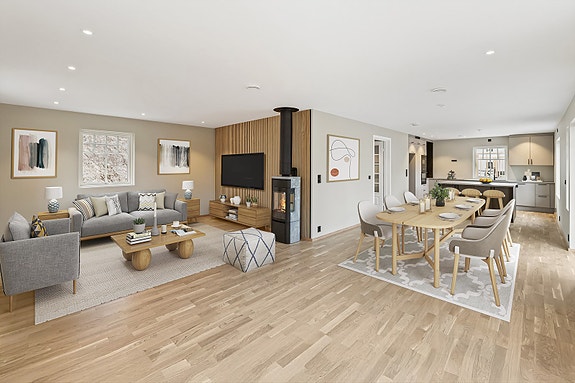 Nordvik har gleden av å presentere Langvikveien 26B- Bildet viser naboboligen slik den står ferdig.Innvendig er det gjort tilvalg, så det samsvarer ikke helt med leveransebeskrivelsen. Det er også digitalt stylet. (FOTO: Fotograf Magik)
