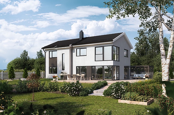 Vi har foreslått boligmodellen Nupen, som er Norgeshus' mest populære kataloghus gjennom mange år. Her får du et stort og funksjonelt hus med mulighet for hele fem soverom, to bad og to stuer. Plassering av rommene åpner for at de voksne tar soverommet i første etasje mens ungene kan boltre seg oppe med egen stue og eget bad.