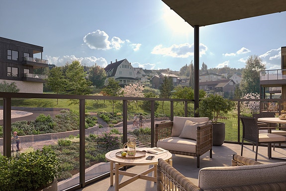 Illustrasjon fra sørvestvendt hjørnebalkong i leilighet B-302 inn mot felles hage. Avvik kan forekomme.