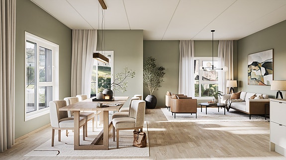 Illustrasjon fra leilighet C-203. Stor og lys 3-roms leilighet med svært romslig stue/kjøkken og balkong i sørvest. Illustrasjon - avvik kan forekomme.